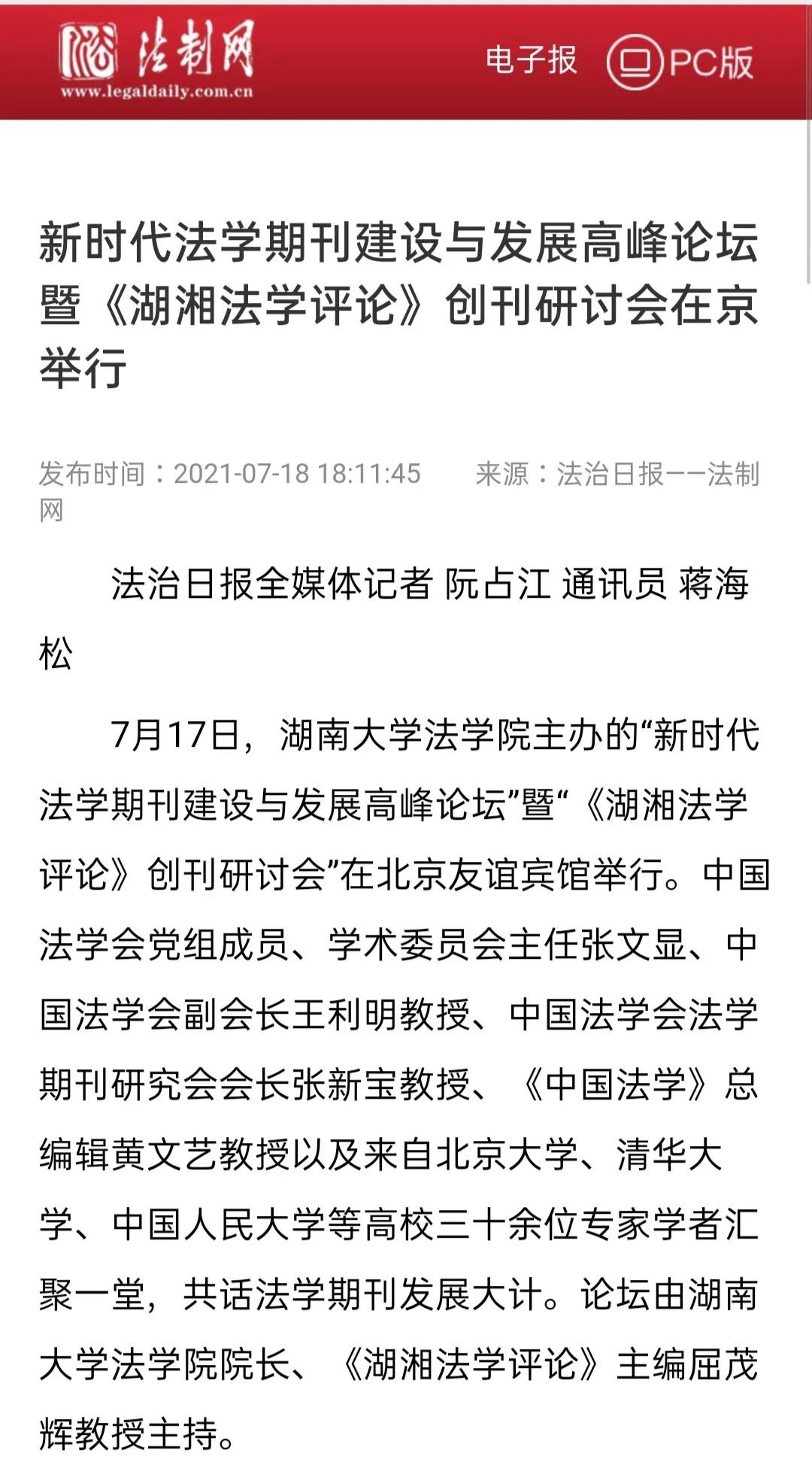 会议的成功召开和《湖湘法学评论》的创刊引发了媒体的高度关注及广泛报道。截止到发稿时为止,已有《光明日报》、人民网-人民资讯、中国新闻网、法治日报—法制网、检察日报-正义网、《法治周末报》、《三湘都市报》、红网、《长沙晚报》为此推出报道。