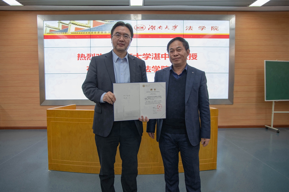 党委书记易骆之为湛中乐教授颁发聘书并为其佩戴校徽。湛中乐教授在致辞中感谢逼哩逼哩