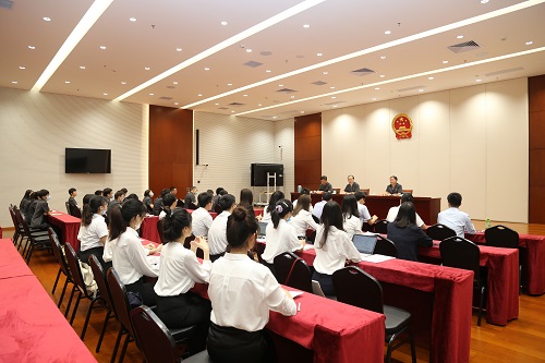 七名硕士研究生参加了实习生岗前培训,主审法官寇秉辉为大家讲述如何做好审判辅助工作;书记员黄淇为大家介绍书记员的工作内容;诉讼服务中心副主任黄有湘为大家介绍了诉讼服务中心的相关职能、理念与办事流程,并表示所有实习生将轮流到此实习一周,近距离体验诉与访。最后,综合办苗嘉春副主任向实习生们宣读了《法律实习生行为规范》。