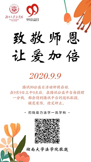 法学一流学科发展基金”盛大启动,并取得了积极进展。现在腾讯99公益日活动即将启动,在9月9日上午9点后,在腾讯公益平台每捐赠一分钱,都会得到腾讯平台的随机配捐,额度有限,抢完即止!