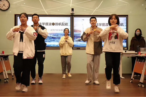 第一部分为梦想律动。法学2102班五名同学进行了名为《我们都是追梦人》的歌舞暖场表演,他们以动人的歌声,灵动的舞蹈,展示了少年时代的青春活力。同时,通过与在场师生的互动,调动了现场氛围,也为此次班会增添了一抹亮色。