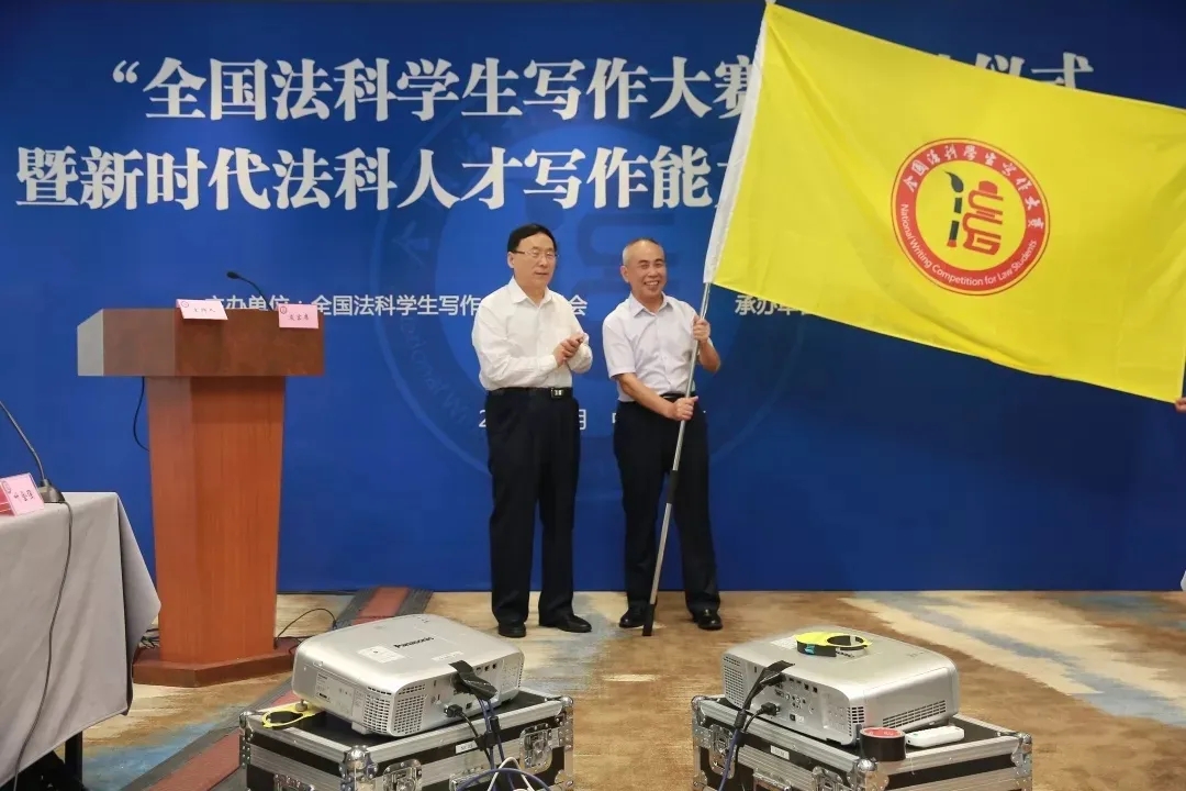 发起的“全国法科学生写作大赛”启动仪式暨“新时代法科学生写作能力培养高峰论坛”在北京友谊宾馆隆重举行,组委会名誉主任张文显教授向组委会秘书长屈茂辉教授授旗)