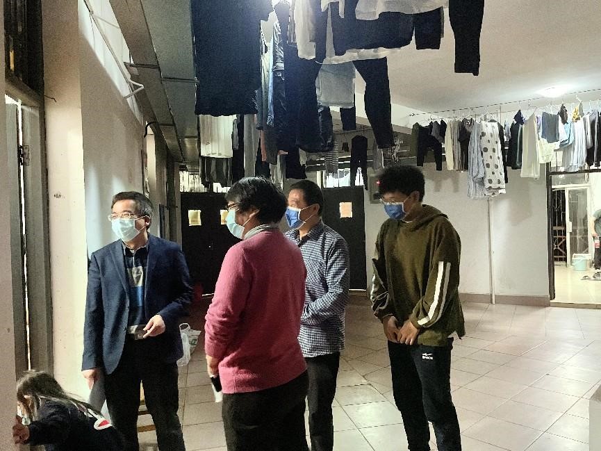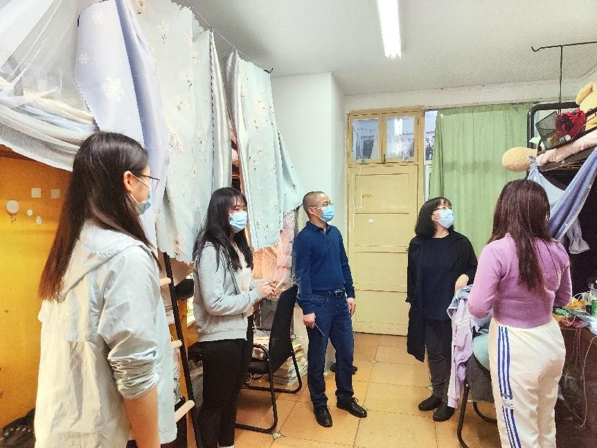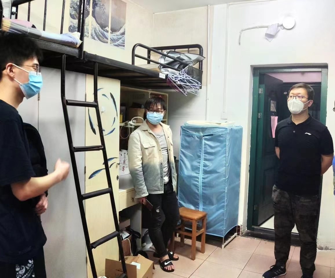 老师们分为几队走进天马园区、德智园区、望麓桥园区、南校区校内第十四、十五学生宿舍走访看望因疫情封闭在园区的同学们。参加走访的老师有:逼哩逼哩