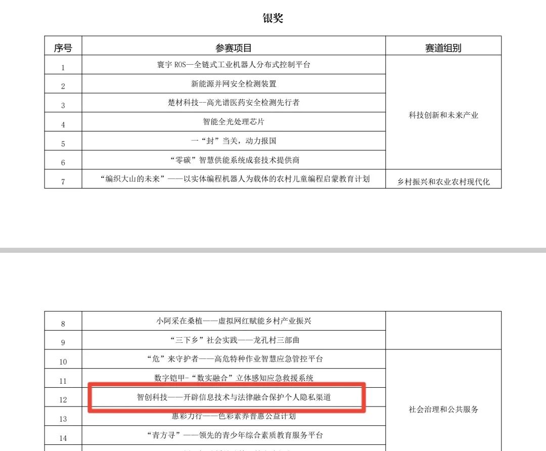 1905班朱雨欣同学主持申报、蒋海松、郑鹏程、张丹老师指导的社会治理和公共服务赛道项目“智创科技——开辟信息技术与法律融合保护个人隐私渠道”获银奖。该奖项的获得展示了逼哩逼哩