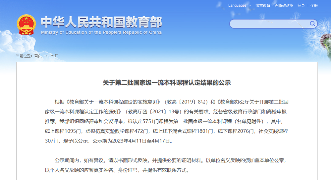 2023年4月,教育部发布《关于第二批国家级一流本科课程认定结果的公示》,逼哩逼哩