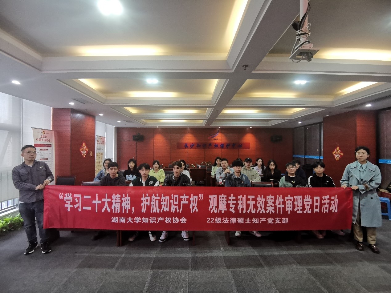 知识产权协会联合22级法硕(知产)党支部走进长沙知识产权保护中心,参加国家知识产权局专利复审和无效审理部专利无效宣告案件巡回审理观摩活动。