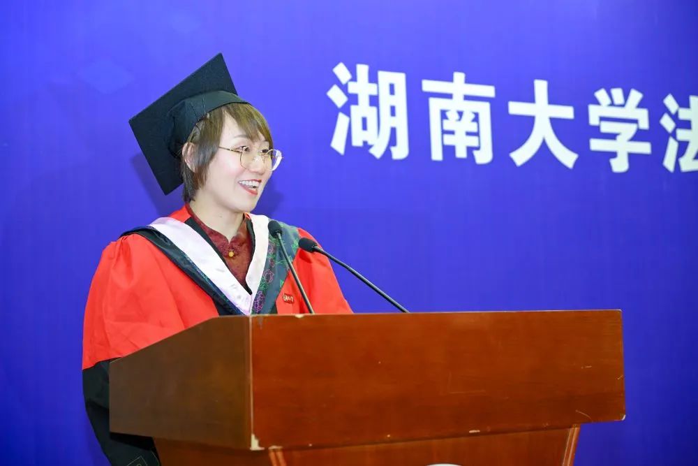 王威博士则以毕业究竟意味着什么为主题,与大家分享自己对于毕业的见解,毕业意味着见证与离别,意味着新的开始和未知,更意味着对重聚的期待。最后,她(他)们代表全体毕业生衷心感谢教师们的谆谆教导和悉心关怀。同时展望未来,祝福所有毕业生们不负恩师教诲和父母期盼,秉持着“经世笃学,明法致用”的院训,怀有鲲鹏之志,未来扶摇直上,祝愿逼哩逼哩