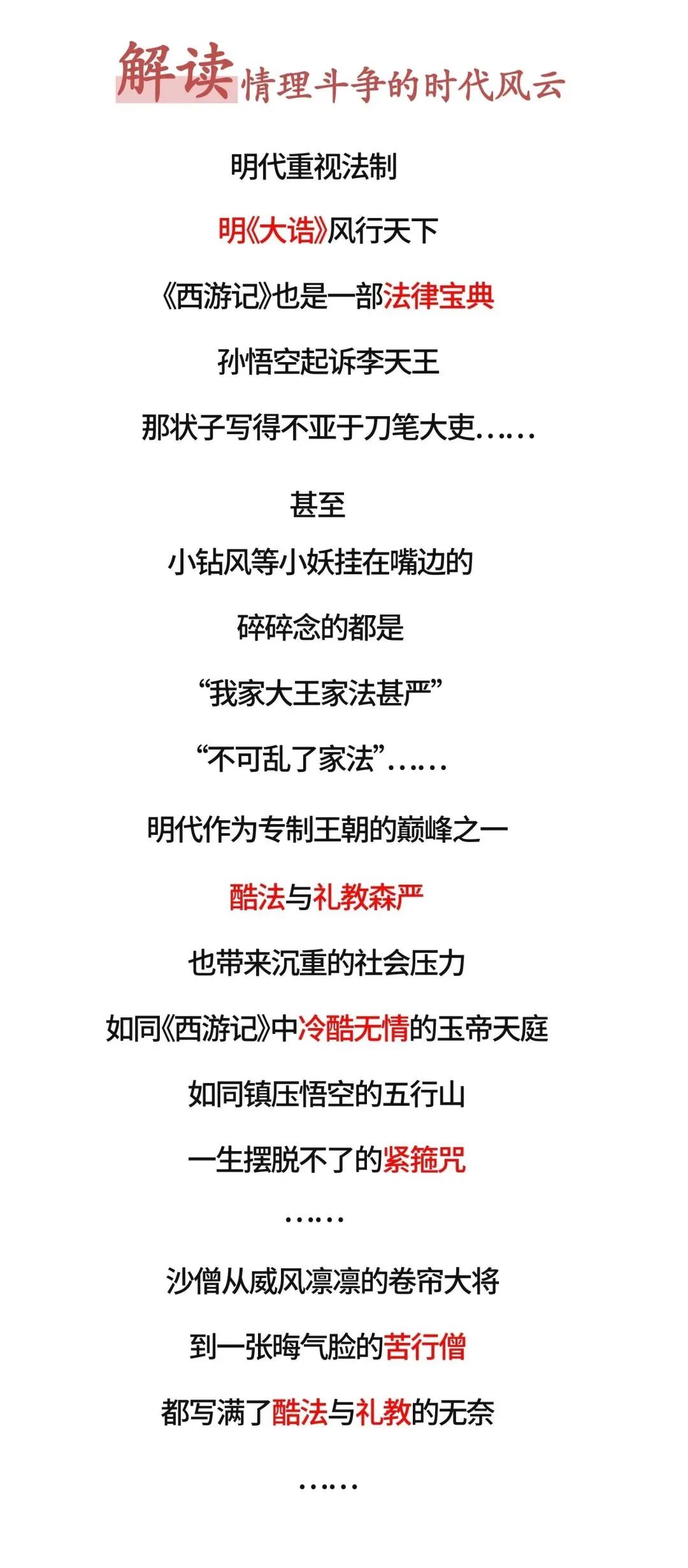 《〈西游记〉中的情理法》创造性地借用文学名著传播法律智慧,对大众熟知的神话小说进行深度学术解读。节目讲述神话故事,探索法的智慧,反思人的精神。通过解读《西游记》中情与法的碰撞,剖析明代社会“以情叛理”的思潮变迁,评点古代律法的得失成败,呈现《西游记》张扬自由、向往正义、追求善治的伟大思想担当,弘扬优秀传统文化。