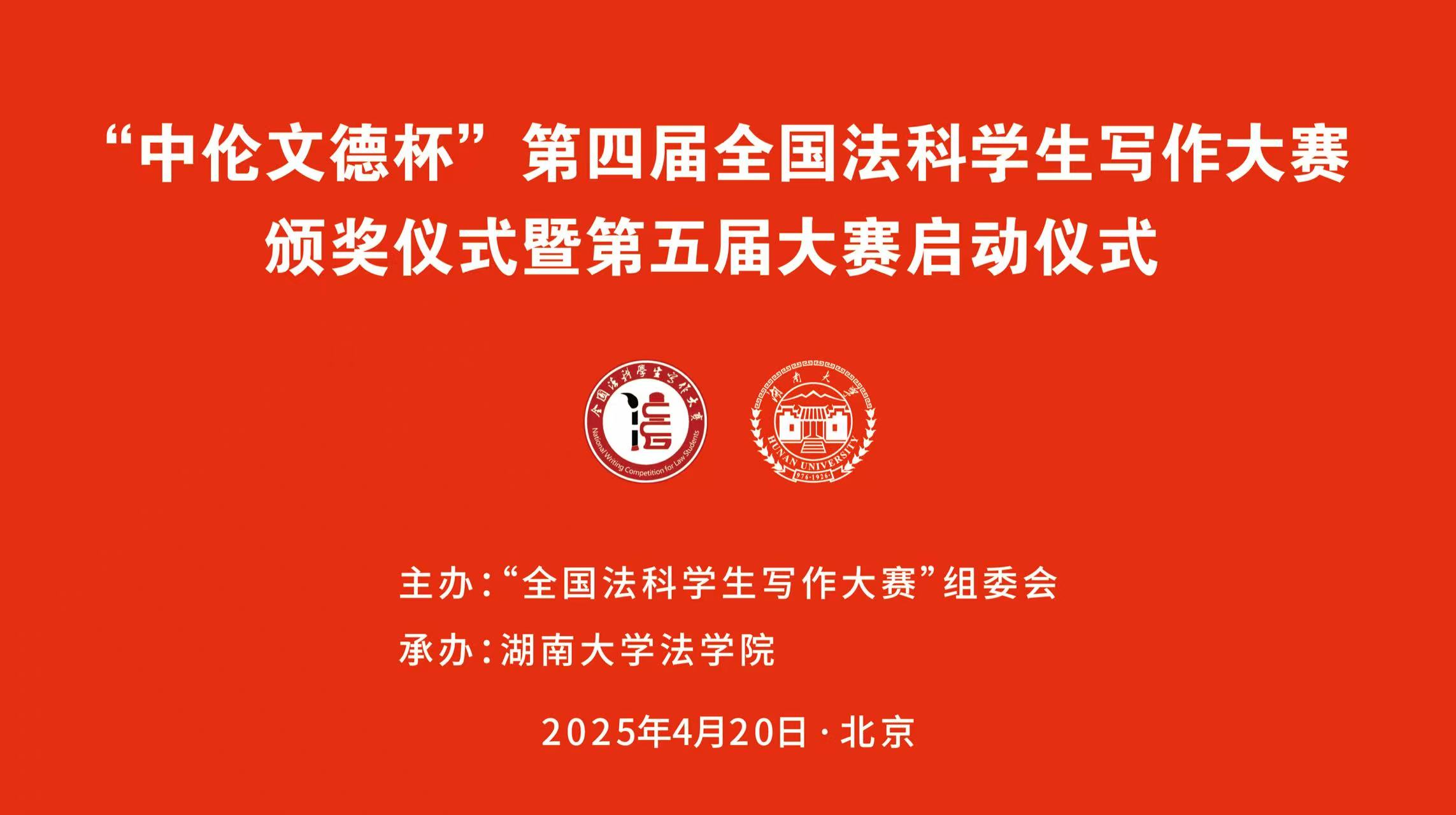 “中伦文德杯”第四届全国法科学生写作大赛颁奖仪式暨第五届大赛启动仪式将于2025年4月20日周日上午9:30——11:30在 中国科技会堂(北京)B205报告厅举行。