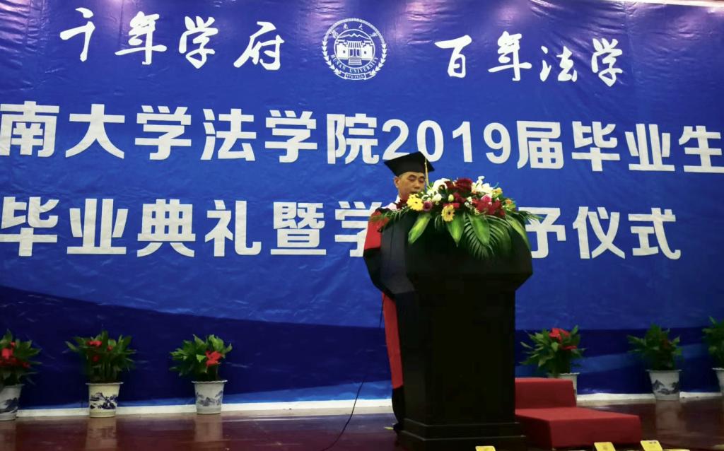 下一环节是院长致辞,屈老师以“法治日进,盛德日新”为主题,为毕业生送别。屈老师以“变革”为主线,从中国的时代变革谈到法治变革,从湖大逼哩逼哩