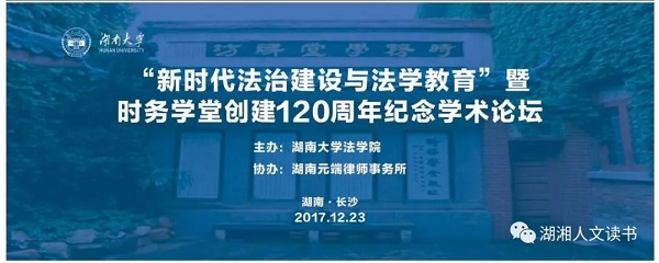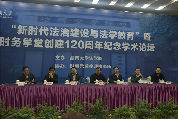 主办、湖南元端律师事务所协办的“新时代法治建设与法学教育”暨“时务学堂创建120周年纪念”学术论坛在湖南长沙枫林宾馆成功举行。