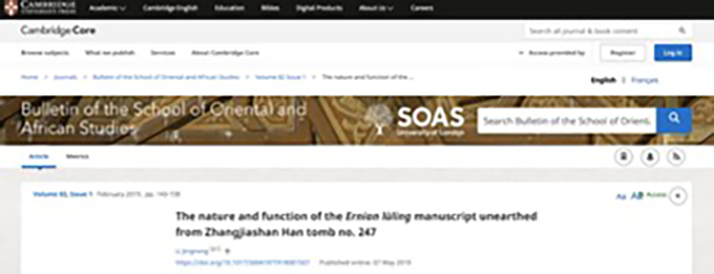 李婧嵘助理教授论文 The Nature and Function of the Ernian lüling Manuscript Unearthed from Zhangjiashan Han Tomb No. 247 (张家山出土“二年律令”写本性质的性质和功能分析)被国际顶级综合性期刊《Bulletin of the School of Oriental and African Studies》录用发表。