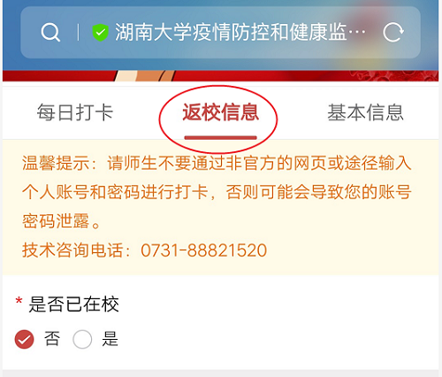 疫情防控和健康监测系统”提交返校申请,填报返校行程的相关信息,上传“湖南省居民电子健康卡”绿码或目前所在地健康绿码。提交申请和填报信息后不得随意变更日期和行程,确有特殊原因需变更的,需向学院及时申请报备。