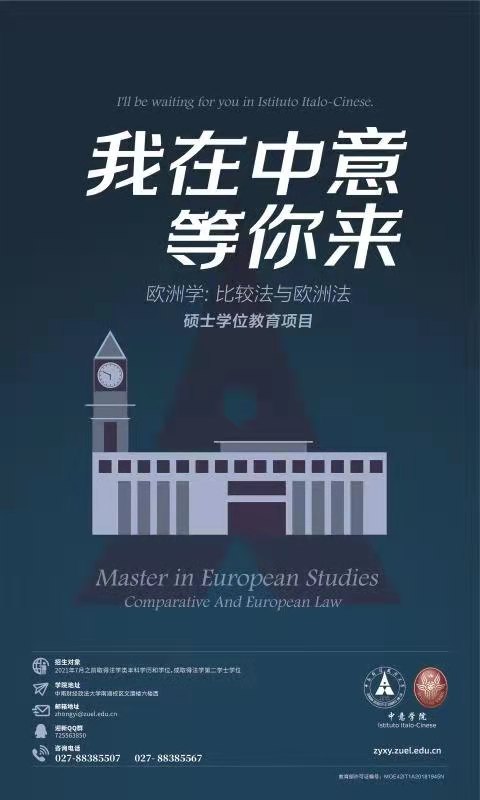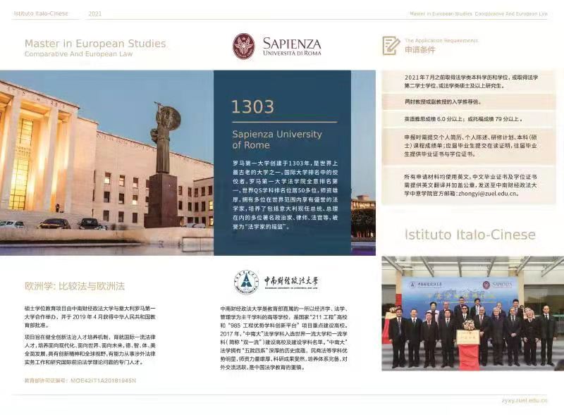 “欧洲学:比较法与欧洲法”硕士学位教育项目由中南财经政法大学与意大利罗马第一大学合作创办,并于2019年4月获得中华人民共和国教育部批准(批准书编号:MOE42IT1A20181945N)。项目旨在健全创新法治人才培养机制,育就国际一流法律人才,培养面向现代化、面向世界、面向未来,德、智、体、美全面发展,具有创新精神和全球视野,有能力从事涉外法律实务工作和研究国际前沿法学理论问题的专门人才。