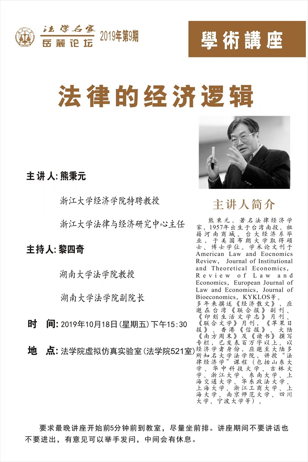 主讲人简介:熊秉元,著名法律经济学家,1957年出生于台湾南投,祖籍河南商城。台大经济系毕业,于美国布朗大学取得硕士、博士学位。学术论文刊于American Law and Economics Review, Journal of Institutional and Theoretical Economics, Review of Law and Economics, European Journal of Law and Economics, Journal of Bioeconomics, KYKLOS等。多年来撰述《经济散文》,应邀在台湾《联合报》副刊、《印刻生活文学志》月刊、《联合文学》月刊、《苹果日报》、香港《信报》、大陆《南方周末》及《读书》撰写专栏,已发表百万字以上。以经济学者身份,应邀至大陆多所知名大学逼哩逼哩