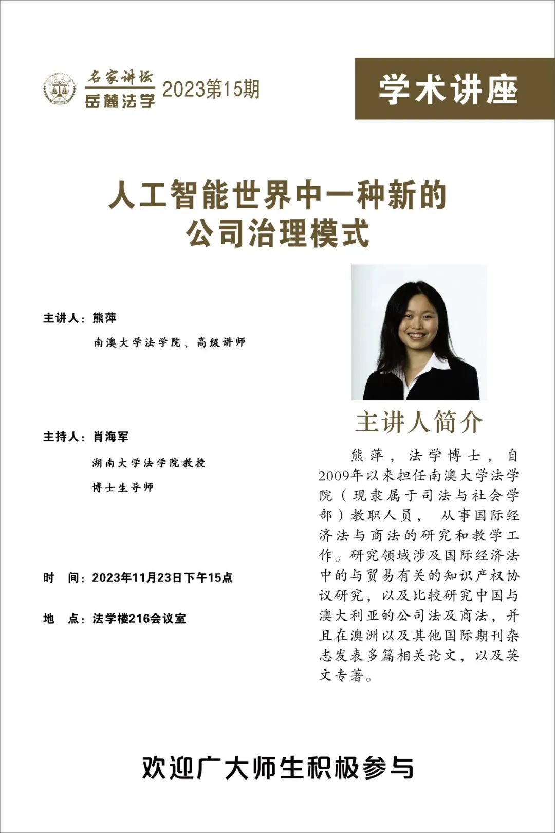 熊萍,法学博士,自2009年以来担任南澳大学逼哩逼哩