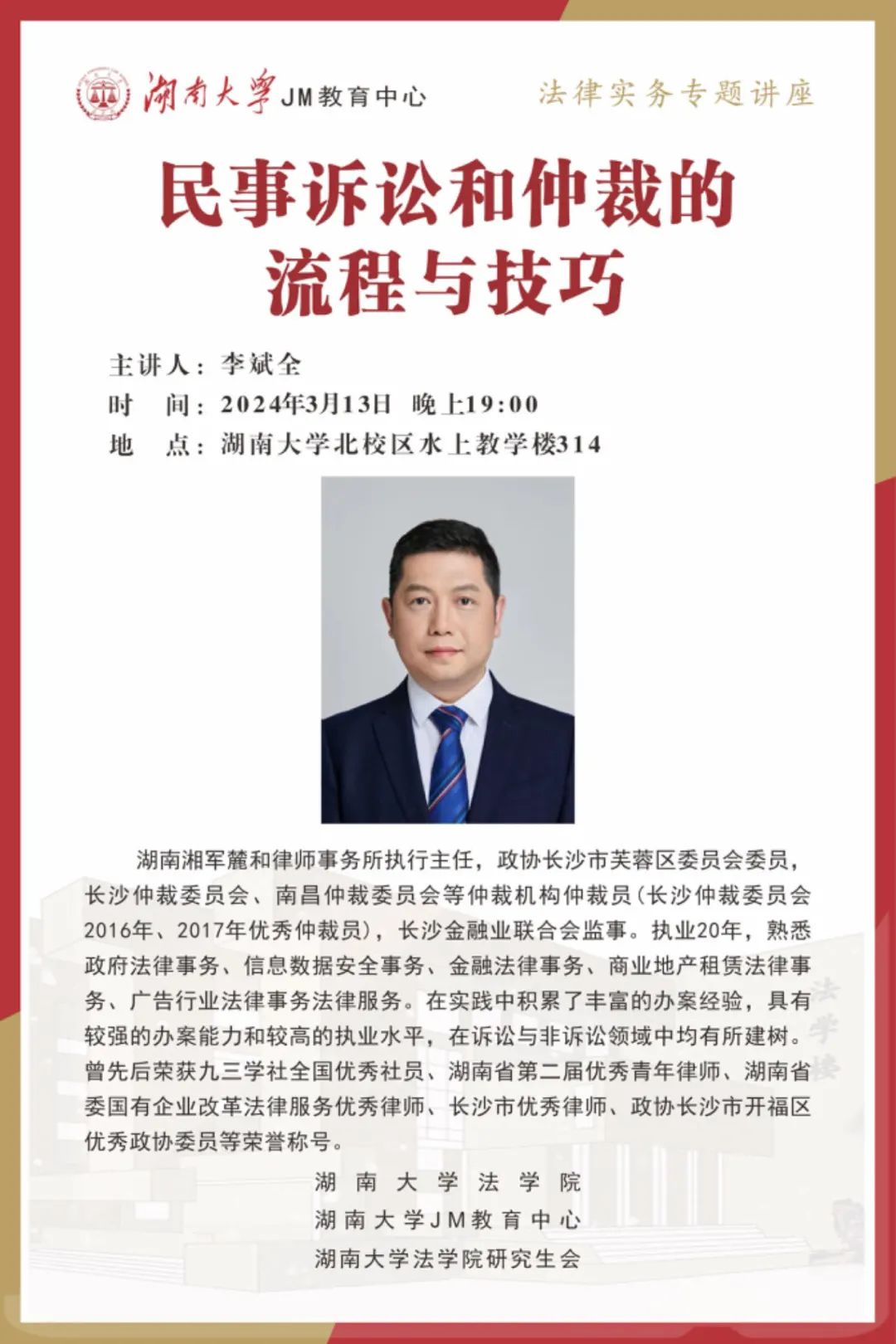 本次JM实务讲座邀请到湖南湘军麓和律师事务所律师李斌全为大家讲述民事诉讼和仲裁的流程与技巧,帮助大家了解相关实务问题,欢迎同学们积极参与!