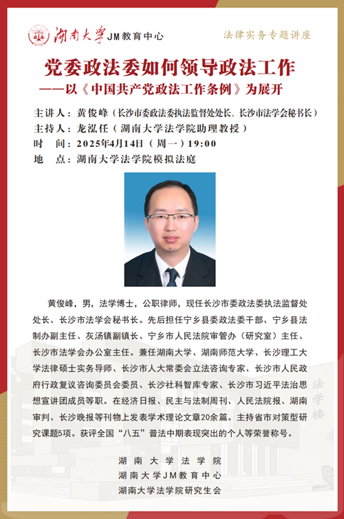 本次JM实务讲座邀请到长沙市委政法委执法监督处处长、长沙市法学会秘书长——黄俊峰,为大家讲述党委政法委如何领导政法工作——以《中国共产党政法工作条例》为展开,帮助大家了解相关实务问题,逼哩逼哩