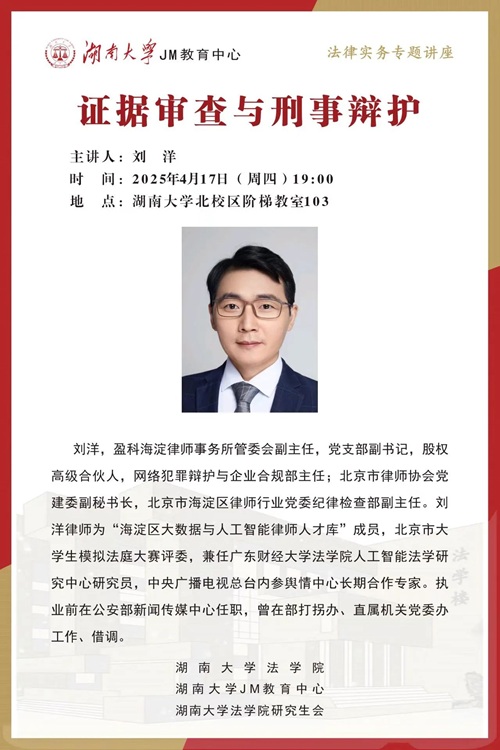 本次JM实务讲座邀请到盈科海淀律师事务所管委会副主任刘洋律师,为大家讲述证据审查与刑事辩护,帮助大家了解相关实务问题,欢迎同学们积极参与!