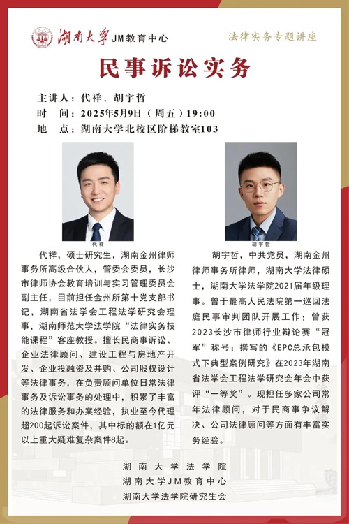 本次JM实务讲座邀请到湖南金州律师事务所律师——代祥、胡宇哲,为大家讲述民事诉讼实务,帮助大家了解相关实务问题,欢迎同学们积极参与!