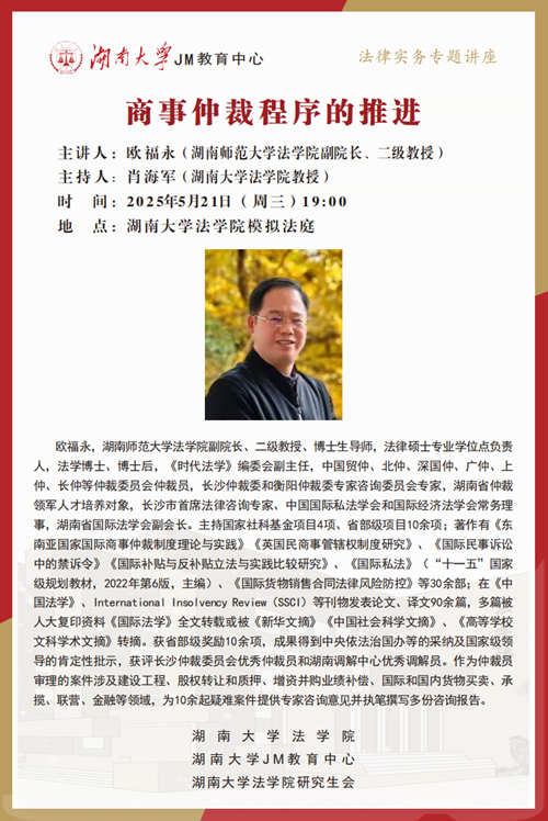 副院长、二级教授、博士生导师欧福永,为大家讲述商事仲裁程序的推进,帮助大家了解相关实务问题,本次讲座由逼哩逼哩