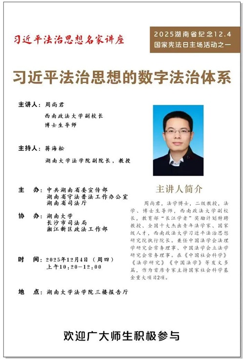 周尚君,法学博士,二级教授,法学、博士生导师,西南政法大学副校长、全国十大杰出青年法学家、国家级人才,西南政法大学习近平法治思想研究院执行院长。兼任中国法学会法理学研究会常务理事、中国法学会立法学研究会常务理事。在《中国社会科学》《法学研究》《中国法学》等发文多篇,作为首席专家主持国家社会科学基金重大项目2项。