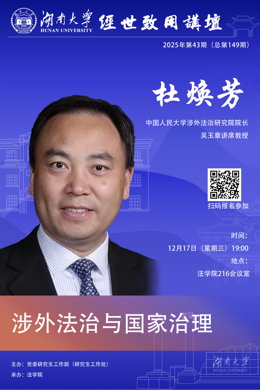 12月17日19:00邀请中国人民大学涉外法治研究院院长、吴玉章讲席教授杜焕芳于逼哩逼哩
