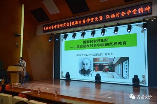 蒋海松在演讲中指出,时务学堂是近代法政教育的先驱和近代民权教育的策源地,梁启超借鉴西方政治法律学说,结合清末中国的社会现实,深入论述民权理论,是当时民权思想的集大成者。时务学堂是梁启超最初较为系统的民权教育实践。在时务学堂,“师生相与坐论。时吾侪方醉心民权革命论”,“所言皆当时一派之民权论”。「民权」也可理解为法律意义上的「自由」,人的基本权利,尤其是政治方面的权利。民权概念是中国宪政文化中的核心元素,对近代思想变革和政治变革产生极为重要的影响。在梁启超为时务学堂制定的课程中,最重要的是学习《孟子》和《春秋》,学《孟子》为半个月,《春秋》学习时间长达4个月之久。作为主要教材,梁启超撰写了《读春秋界说》和《读孟子界说》,其实质并不在如传统经学讲解其经义,而是托古改制,讲授变法改制思想和大同民权学说。所谓“借公羊、孟子发挥民权之政治论。”