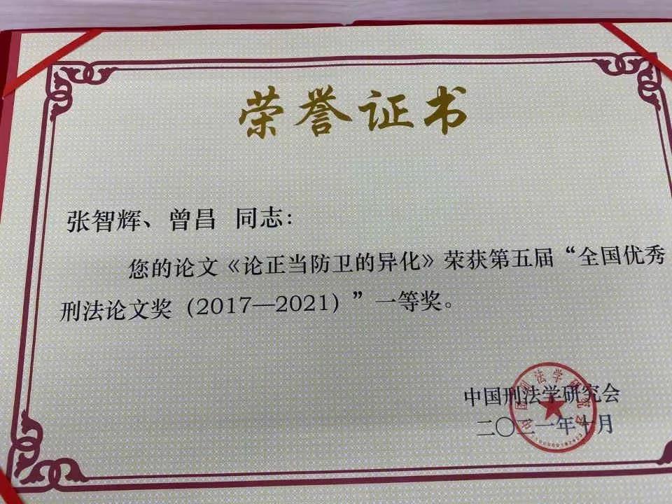 张智辉教授、曾昌博士研究生合著《论正当防卫的异化》一文被评为第五届全国优秀刑法论文奖(2017-2021)一等奖,逼哩逼哩