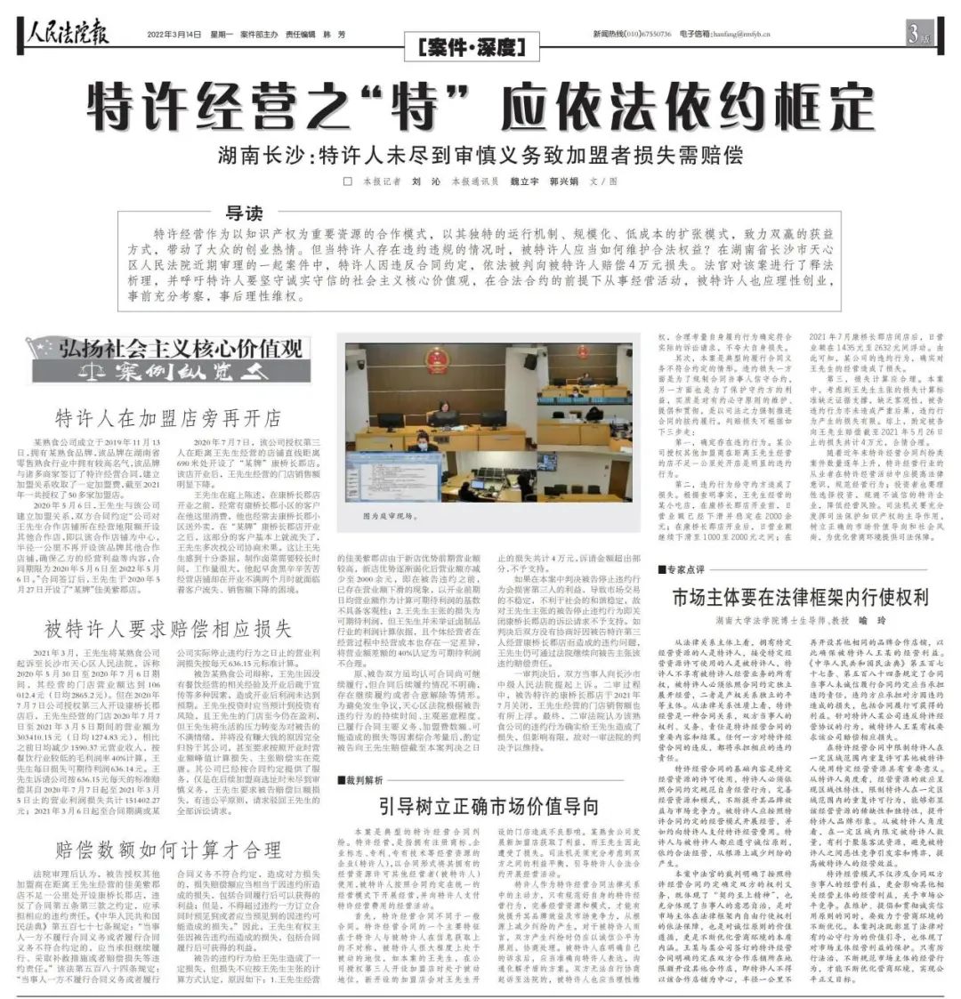 在湖南省长沙市天心区人民法院近期审理的一起案件中,特许人因违反合同约定,依法被判向被特许人赔偿4万元损失。法官对该案进行了释法析理,并呼吁特许人要坚守诚实守信的社会主义核心价值观,在合法合约的前提下从事经营活动,被特许人也应理性创业,事前充分考察,事后理性维权。逼哩逼哩