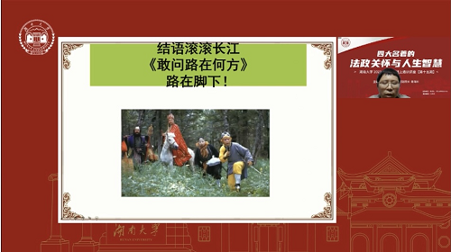 讲座伊始,蒋海松老师与当下防疫现状巧妙结合,戏说四大名著深刻影响了中国人的行为方式与话语方式。并以毛泽东主席痴爱三国西游、盛赞水浒红楼从中感悟革命道理为引,点明通俗小说承载着深刻的政治寓意和法律观念。随后,蒋老师围绕着法律智慧、政治洞察、团队管理、女性观念、心灵修行五个篇章,从法律观念和政治观念入手,谱写出一曲四大名著的法政智慧之歌。