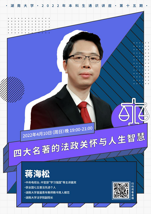 副院长蒋海松副教授以“四大名著的法政关怀和人生智慧”为主题,为大家带来了一场别开生面的法律盛宴。本次讲座由逼哩逼哩
