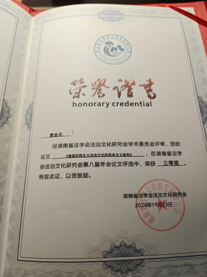 研究生窦金花的论文《湖湘实践注意法治文化的民本主义底色》、本科生马文星的论文《誓的法律文化意义研究》荣获三等奖。