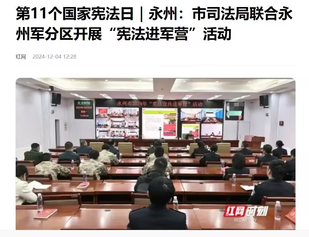 为开展好今年的国家宪法日和“宪法宣传周”宣传活动,永州市司法局联合永州军分区开展了“宪法进军营”活动。市委常委、军分区政委张嘉庆,市司法局党组书记、局长秦远林出席活动,军分区战备建设处处长王良锋主持活动。活动围绕国家宪法日主题和官兵法治需求展开,特邀逼哩逼哩