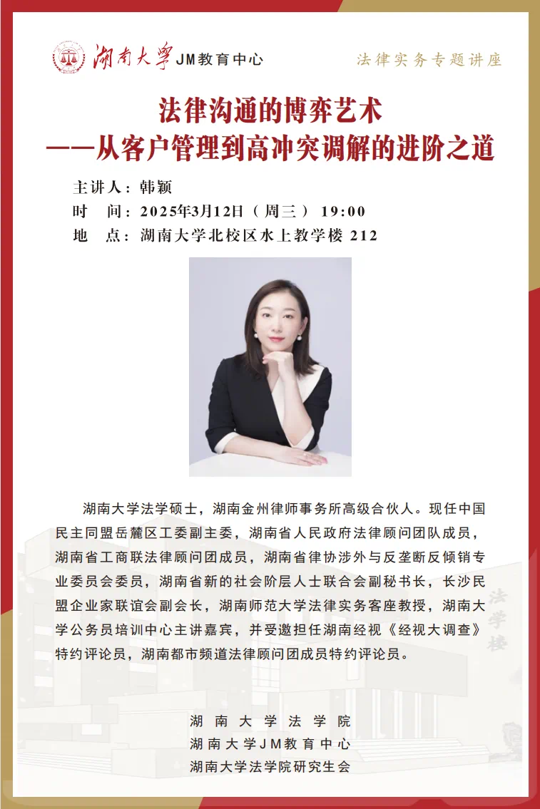 法学硕士,现任中国民主同盟岳麓区工委副主委、湖南省人民政府法律顾问团队成员、湖南省工商联法律顾问团成员、湖南省律协涉外与反垄断反倾销专业委员会委员等,同时还是多家媒体的特约评论员和法律顾问。本次讲座吸引了逼哩逼哩