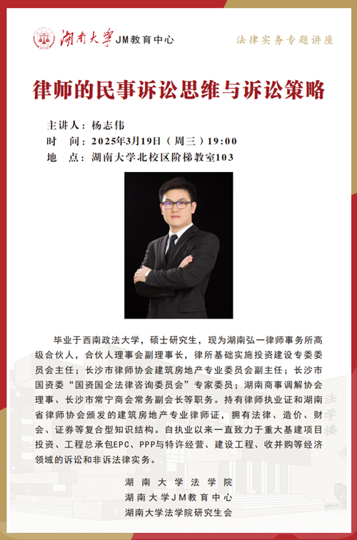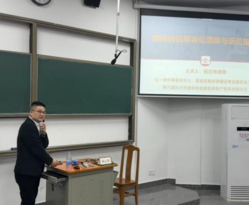 北校区阶梯教室103以“律师的民事诉讼思维与诉讼策略“为主题展开讲座。杨志伟律师现任湖南弘一律师事务所高级合伙人,合伙人理事会副理事长,律所基础实施投资建设专委委员会主任;长沙市律师协会建筑房地产专业委员会副主任;长沙市国资委“国资国企法律咨询委员会”专家委员;湖南商事调解协会理事、长沙市常宁商会常务副会长等职务。持有律师执业证和湖南省律师协会颁发的建筑房地产专业律师证,拥有法律、造价、财会、证券等复合型知识结构。自执业以来一直致力于重大基建项目投资、工程总承包EPC、PPP与特许经营、建设工程、收并购等经济领域的诉讼和非诉法律实务。诸多逼哩逼哩