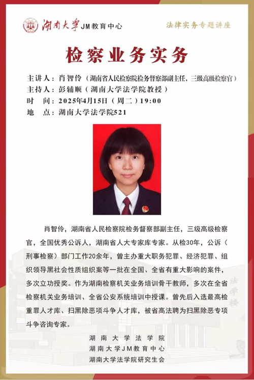2025年4月15日19:00,湖南省人民检察院检务督察部副主任,三级高级检察官肖智伶在湖大521教室开讲“检察业务实务”,逼哩逼哩