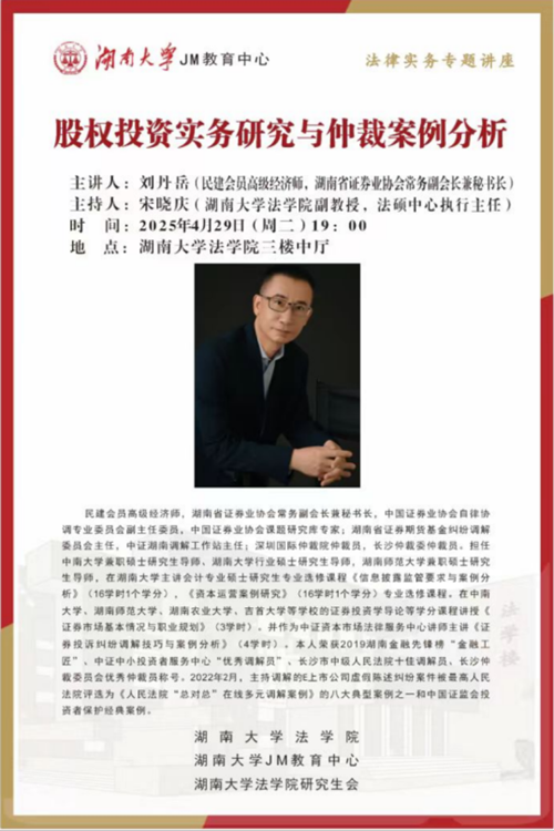 2025年4月29日19:00,民建会员、高级经济师、湖南省证券业协会常务副会长兼秘书长刘丹岳在湖大法学楼102教室开讲“股权投资实务研究与仲裁案例分析”,逼哩逼哩