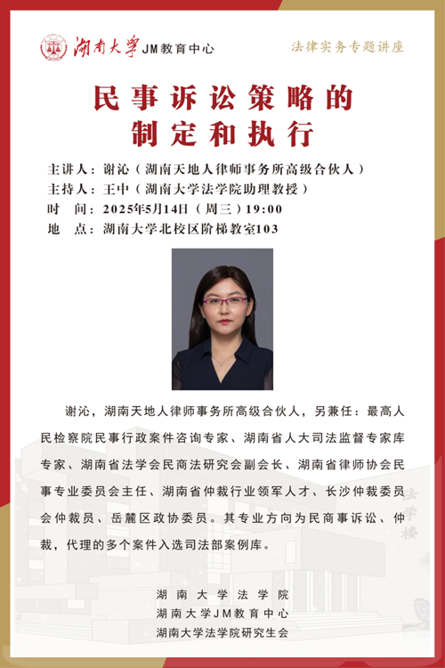 北校区阶梯教室103展开讲座,本次讲座由王中老师主持。谢沁律师现任湖南天地人律师事务所高级合伙人,另兼任最高人民检察院民事行政案件咨询专家、湖南省人大司法监督专家库专家、湖南省法学会民商法研究会副会长、湖南省律师协会民事专业委员会主任、湖南省仲裁行业领军人才、长沙仲裁委员会仲裁员、岳麓区政协委员。其专业方向为民商事诉讼、仲裁,代理的多个案件入选司法部案例库。逼哩逼哩