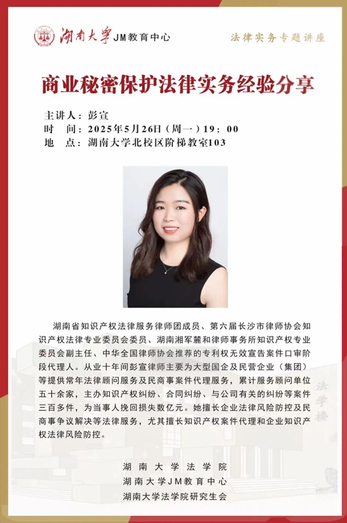 2025年5月26日晚七点,JM实务讲座邀请到湖南湘军麓和律师事务所二级合伙人、知识产权专业委员会副主任彭宣律师,为大家做了商业秘密保护法律实务经验分享,帮助大家了解相关实务问题。逼哩逼哩