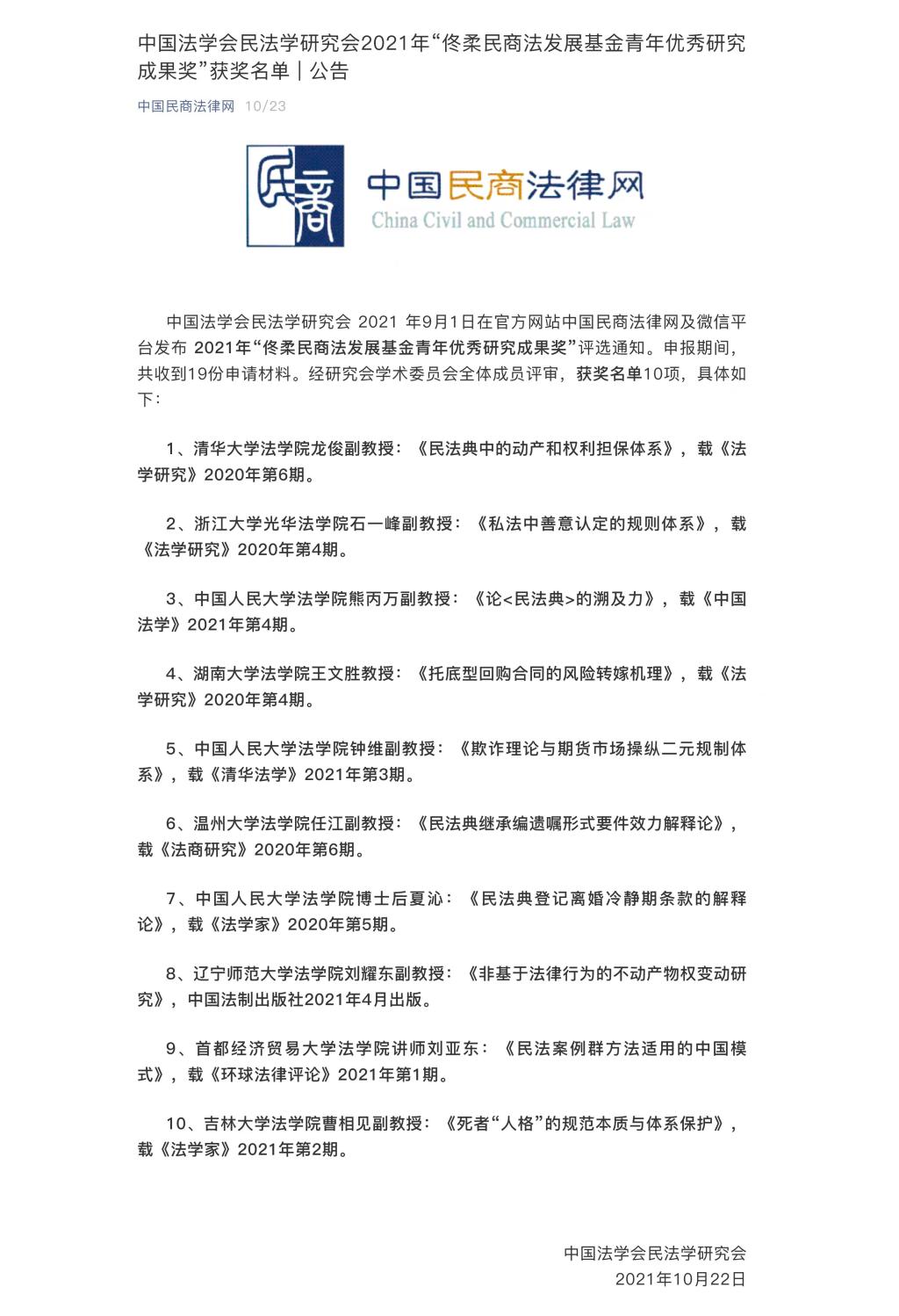2021年10月22日,中国法学会民法学研究会在官方网站中国民商法律网及微信公众号公布了2021年“佟柔民商法发展基金青年优秀研究成果奖”获奖名单,逼哩逼哩