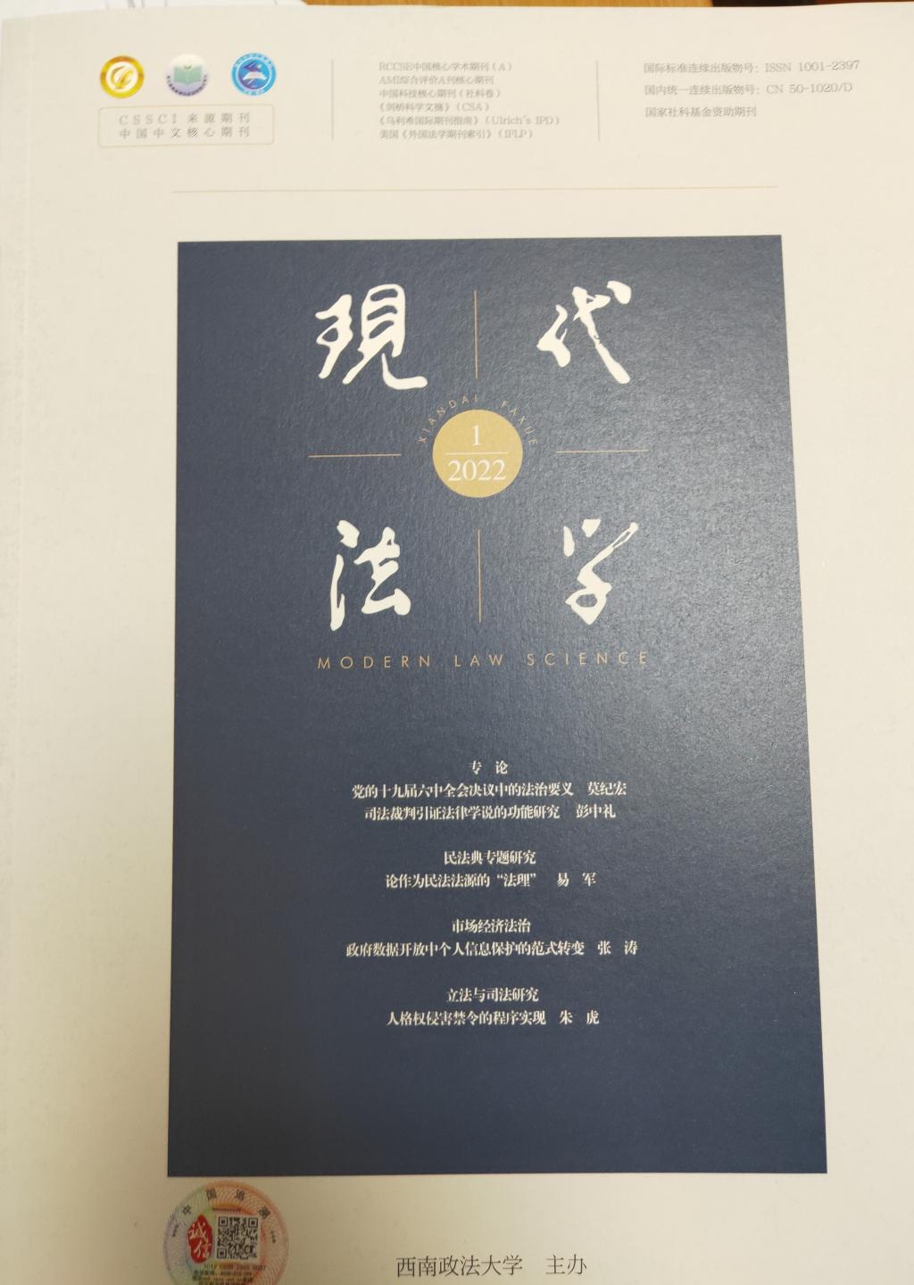 副教授蒋海松在法学类CSSCI核心期刊《现代法学》2022年第1期发表论文《民法典传统基因与民族特色的法理解析》。