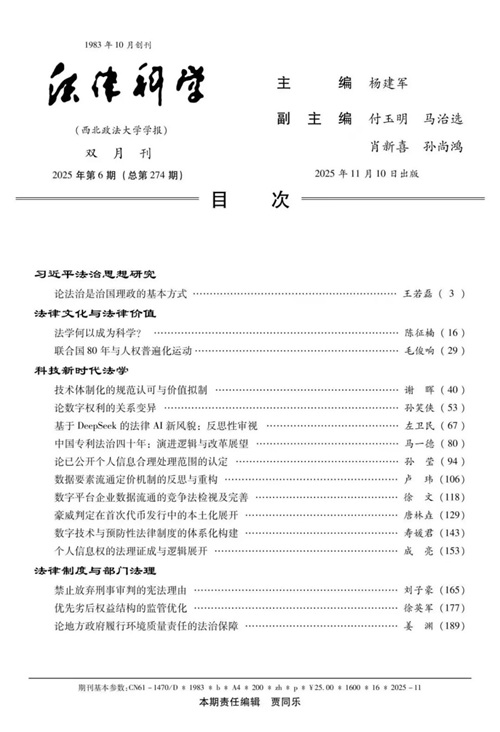 成亮老师在《法律科学》2025年第6期发表论文《个人信息权的法理证成与逻辑展开》。