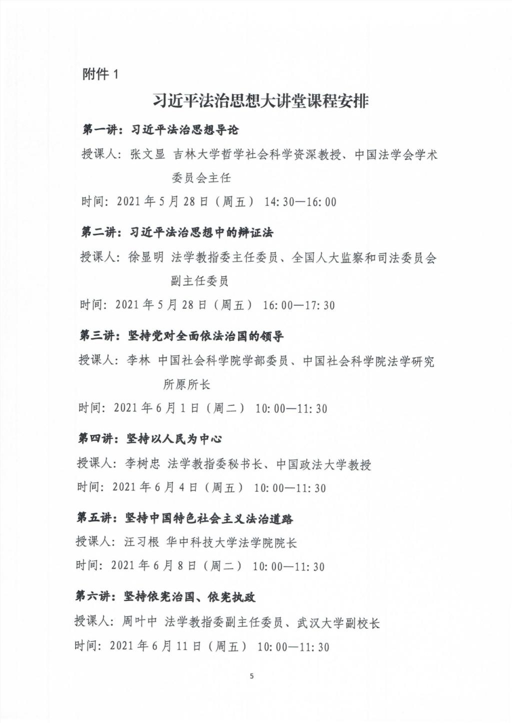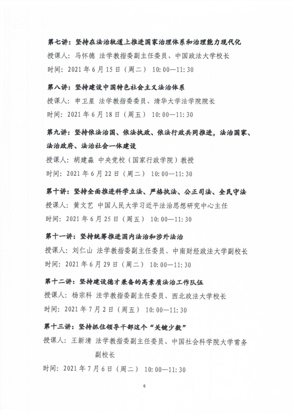 “习近平法治思想大讲堂”课程共计13讲,计划于2021年5月28日至7月6日每周二、周五开设网络直播讲座(课程安排附后)。