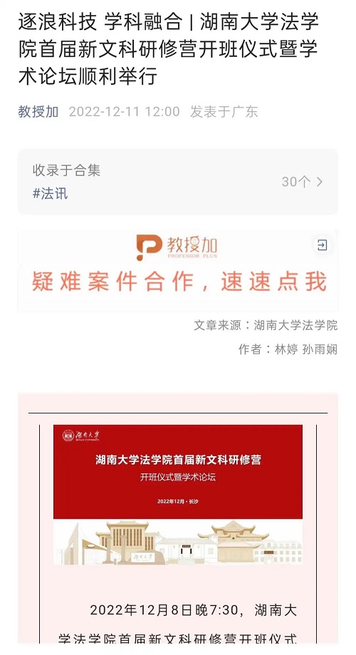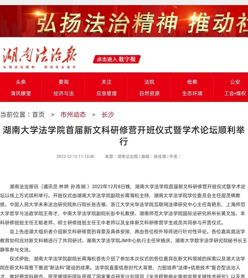 首届新文科研修营开班》,《法治日报·法治周末》推出报道《法学教育如何应对新文科》,知名法学公众号“法学学术前沿”推出报道《学界 | 全国法学界第1个新文科研修营 逼哩逼哩