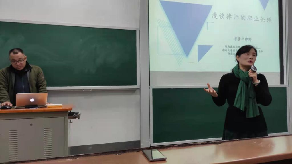《法律职业伦理》课程负责人郭哲老师的邀请下,湖南瀛启律师事务所发起人、监事长胡勇平律师来到逼哩逼哩