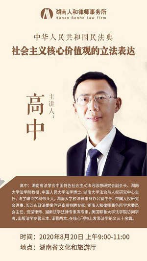 高中教授在讲座中提出,从民法典的法律原则到具体条文都浸润了社会主义核心价值观的要求,承载着引导规范人们践行社会主义核心价值观的重要使命。比如,民法所彰显的平等、公平、意思自治、诚信、公序良俗等基本原则,是社会主义核心价值观的体现。民法典的绿色原则体现了“文明”“和谐”等价值观。他用理论联系实际,以生动的案例,深入浅出地对民法典等进行了解读学习。