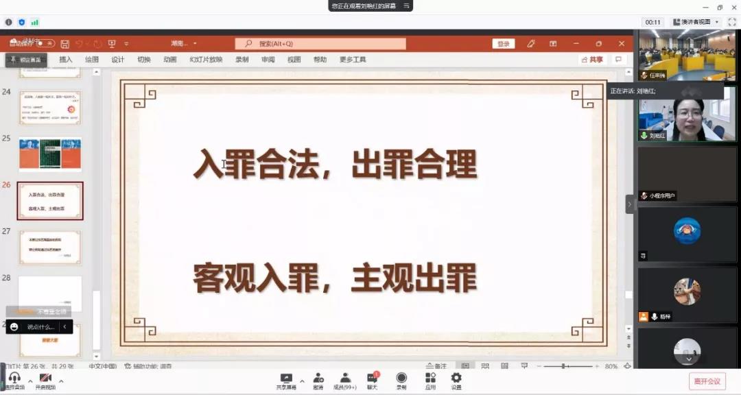 刘老师以“刑法的良知”为主题,从刑事司法实务现状分析、刑法的良知是什么、刑法良知的判断标准、恪守良知的路径等四个方面展开讲解。