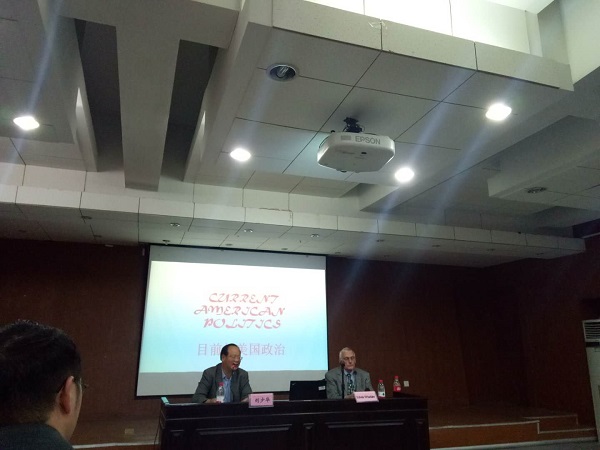 讲座伊始,刘少华教授对 Edwin Winckler 教授的来访表示了热烈地欢迎。Edwin Winckler教授介绍道本次讲座分为三个部分,分别是quick course、 basic dynamics和current contradictions。接着,Edwin Winckler 教授用清晰流利的中文展开了讲解,远到美国成立之初政治力量近到2016年美国大选, 同学们在教授的讲解下对美国政治有了初步的了解。然后,Edwin Winckler教授重点分析了特朗普为何支持率低于希拉里却当选了总统的原因,Edwin Winckler教授幽默诙谐的讲课方式极大地提高了同学们的兴趣,也进一步地促进了同学们对美国政治的认识。