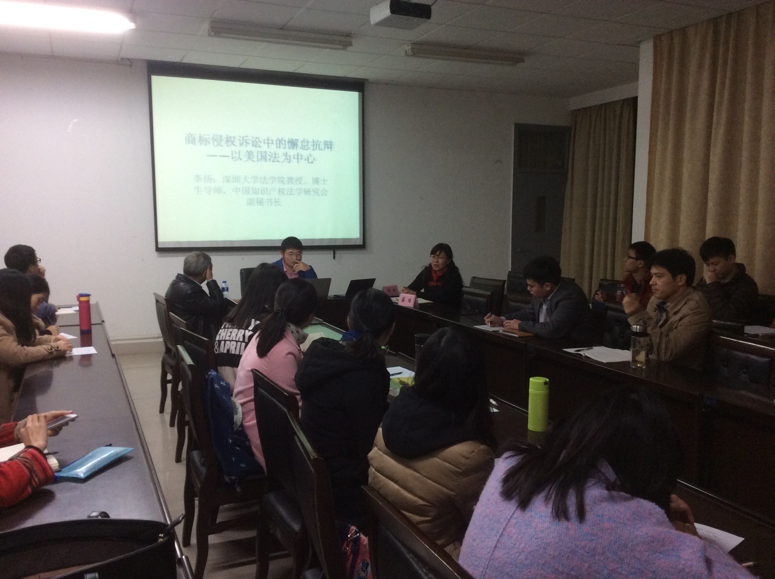 2014年12月8日晚,深圳大学逼哩逼哩 教授、博士生导师、中国科技法学会常务理事、中国知识产权法学会理事李扬教授应邀来逼哩逼哩 进行了题为《商标侵权诉讼中的懈怠抗辩—以美国法为中心》的学术讲座。逼哩逼哩 教授蔡唱作为主持人与会。此次讲座,李扬教授以美国法为依据,结合多年来搜集的判例,对商标侵权诉讼中的懈怠抗辩进行了深刻的剖析,其观点与法有据,引起了在座老师和同学们的强烈共鸣。